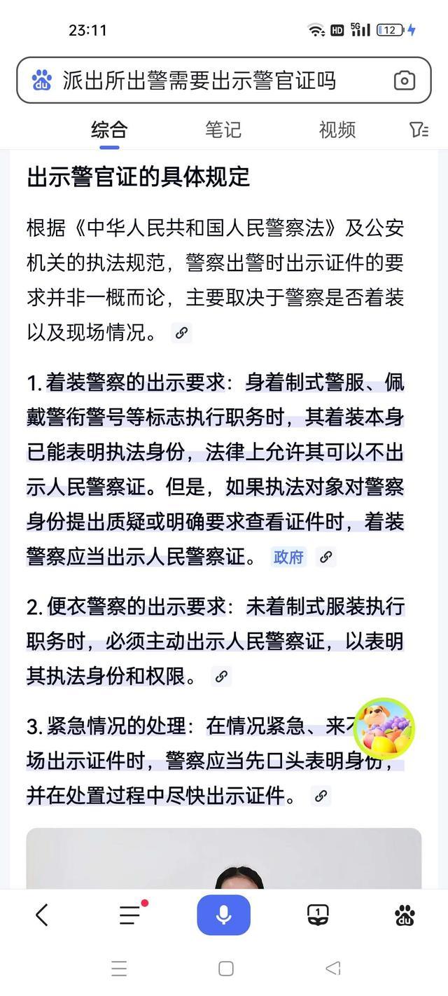1、(根据《中华人民共和国人民警察法》及公安机关的执法规范,警察出警时出示证件的要求并非一概而论,主要取决于警察是否着装以及现场情况。1。着装警察的出示要求:身着制式警服,佩戴警衔警号等标志执行职务时,其着装本身已能表明执法身份,法律上允许其可以不出示人民警察证。但是,如果执法对象对警察身份提出质疑或明确要求查看证件时,着装警察应当出示人民警察证。2。便衣警察的出示要求:未着制式服装执行职务时,必须主动出示人民警察证,以表明其执法身份和权限。3。紧急情况的处理:在情况紧急,来场出示证件时,警察应当先口头表明身份,并在处置过程中尽快出示证件。)